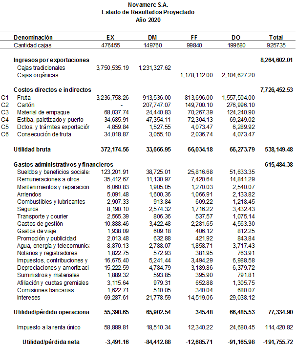 Para los costos y gastos de exportación y los gastos de administración y financieros, se tomó la variación de los años 2017 – 2018 y 2019, dando como resultado un incremento del 2%. Cabe mencionar que en el presupuesto de gastos operacionales se considera el cartón y estiba de las cajas excelban, sin embargo, éstos son asumidos y cancelados a