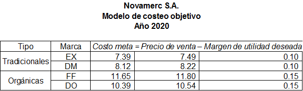 El comercio de banano es extremadamente competitivo, lo que hace que los márgenes unitarios sean bajos. Al no poder fijar un precio, se elaboró en base a los precios históricos. En cuanto a la utilidad deseada, la alta gerencia determinó que sea 0.10 por caja de banano de producción tradicional, y 0.15 por caja de banano orgánico. El costo meta máximo por caja Excelban es $7.39, Del Monte convencional $ 8.12, Fyffes orgánicas $ 11.65 y Del Monte orgánica $ 10.39 como se muestra a continuación: