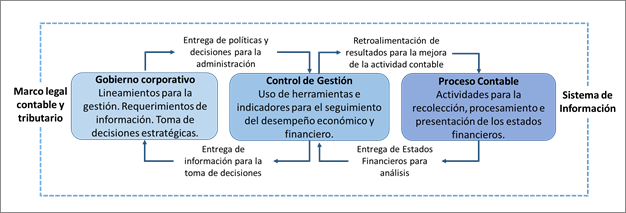 El entorno cambiante y a veces impredecible al que se enfrentan las empresas, tales como: los cambios en la capacidad adquisitiva del mercado, contracción o dilatación de los sectores económicos, la competencia de mercado, los cambios tecnológicos, así como los cambios en el escenario interno como rotación del personal, cambios en la legislación laboral, y tantos otros factores, hacen necesaria la aplicación de los procesos contables ya no con fines tributarios, sino con fines estratégicos y de control (Porporato, 2015). Para ello, la contabilidad con orientación de gestión brinda a las organizaciones la información imprescindible sobre el desempeño de la misma y otros aspectos clave para la toma de decisiones (Valdez, Nazareno, y Tóala, 2017), especialmente a nivel gerencial y directivo por ser quienes determinan el rumbo de la misma, como aprovechar o rechazar oportunidades de inversión, cambios en los activos y patrimonio, reinversión en el negocio, incursión en nuevos productos y mercados, entre tantos otros escenarios posibles, siendo necesario contar con un proceso de gestión donde la contabilidad sea eje medular en la gerencia, Colina(2017).