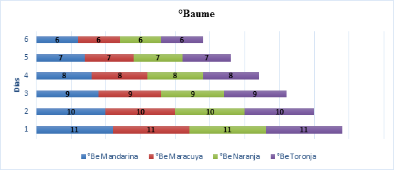 La cantidad de Azúcar se puede medir por varios métodos lo Grados Baumé es uno de ellos, la variación desde su inicio fue regular en los cuatros casos de los vinos frutales evaluados. Cada °Be contiene 17 gramos de azúcar por cada 1itro de vino, es necesario referirse a una tabla de relaciones para vinos.