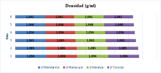 Las muestras evaluadas mostraron una variación en la evolución del grado alcohólico, específicamente en el tercer y cuarto día en los casos del vino de Toronja y Naranja y mantuvieron su balance en los casos de Mandarina y Maracuyá. Sin embargo, el grado alcohólico al final es menor en los dos primeros casos (Vino de Toronja y Naranja).