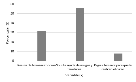 La investigación también se encaminó a definir la forma en que los maestros realizan sus capacitaciones virtuales, los datos estadísticos se presentan en la figura 4, la información obtenida refleja que el 32% de los docentes realizan el curso de forma autónoma, el 56% requieren la ayuda de amigos o familiares y el 8% paga a terceros para que le realicen los seminarios virtuales.