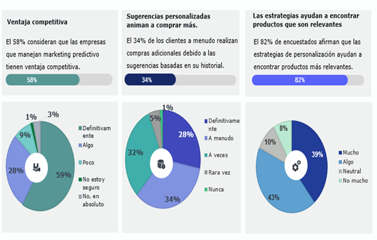 Una parte significativa de los encuestados percibe que las empresas que implementan marketing predictivo poseen una ventaja competitiva en el mercado. Las sugerencias personalizadas motivan a una parte considerable de los clientes a realizar compras adicionales, basándose en su historial. Casi la totalidad de los encuestados afirma que estas estrategias son efectivas, contribuyendo significativamente o moderadamente a la identificación de productos pertinentes.