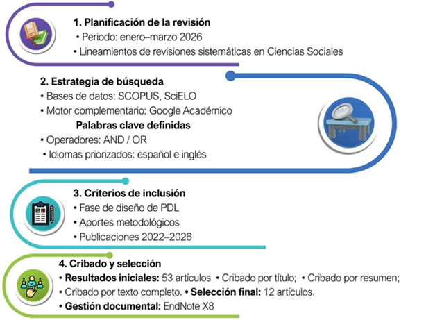 Se realizó una investigación con enfoque mixto, estructurada en dos fases. El componente cuantitativo consistió en un análisis de centralidad y frecuencias a partir de una matriz binaria derivada de una revisión sistemática de literatura, con el objetivo de identificar las fases del ciclo de vida más utilizadas en el diseño de PDL y las principales brechas metodológicas (Figura 1). El componente cualitativo se orientó a la identificación de dichas brechas, la construcción de un procedimiento metodológico para el diseño de PDL y su validación mediante juicio de expertos y modelado con redes de Petri.