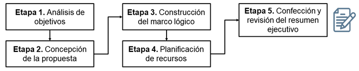 La etapa se enfoca en elaborar un documento sintetizado que contenga la justificación, objetivos, plan de trabajo, análisis de factibilidad, riesgos identificados y beneficios esperados. En la presente investigación se utilizó el modelo número 1 para el diseño del resumen ejecutivo de las propuestas de proyectos de desarrollo local, para presentarse a la aprobación del CAM y el Gobernador.