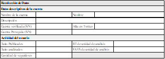 El análisis de contenido se aplicó a un total de 20.552 tuits. Las unidades de análisis fueron los tuits individuales. Una vez que con RStudio obtuvimos las cuentas con mayor actividad, observamos directamente esos perfiles de Twitter y las reacciones generadas por sus publicaciones. Para describir la actividad de las cuentas diseñamos un instructivo de aplicación donde cada una de las unidades de análisis fue codificada mediante una ficha de recogida de datos: