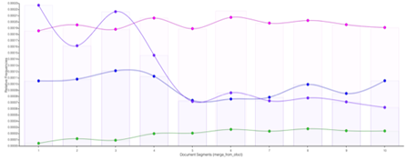 La Figura 1 da cuenta de la frecuencia en segundos con la cual se tuitearon los términos. Vemos un conjunto de puntos conectados por una línea que muestran tendencias en el uso de los términos a lo largo del lapso de estudio. En el eje horizontal colocamos el período de tiempo; en tanto en el vertical, la frecuencia relativa. La línea azul traza al término [derechos], la línea verde al [feminicidio], la línea violeta a [igualdad] y la línea rosa a [feminista].