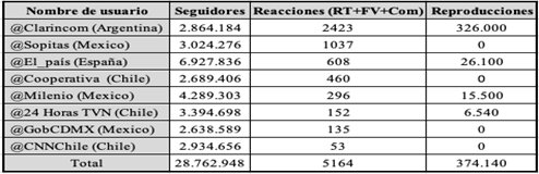 Las otras cuentas que completan la tabla son: @Milenio del portal de noticias de México (5.74%); @24horasTVN, de la Televisión Nacional de Chile (2.94 %); @GobCDMX, del Gobierno de la Ciudad de México (2.61%) y @CNNChile (1.03%).