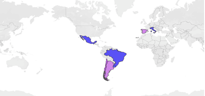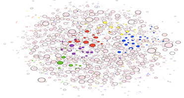 Uno de los elementos clave para analizar una red es su modularidad que expresa la división de una red en módulos (grupos, comunidades). Los colores del grafo de la Figura 3 nos aportan datos de las comunidades con mayor modularidad: el azul representa a Chile (1.95%); el rojo a Argentina (1.65%), el amarillo a España (1.63%), el violeta a Brasil (1.58%) y el verde a Uruguay (1.52%). Hemos decidido colorear con una misma tonalidad al resto de los nodos para que puedan visualizarse mejor los clusters más relevantes en términos de interacción.