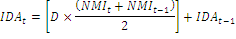 Donde INA: ingresos netos actualizados a una tasa de referencia; ENA: egresos netos actualizados a una tasa de referencia; IDAt= número de individuos-día acumulados en el muestreo t; IDAt-1= número de individuos-día acumulados en el muestreo anterior (t-1); D= número de días entre el muestreo (t-1) y t; NMIt= número medio de individuos en el muestreo t; NMIt-1= número medio de individuos en el muestreo (t-1) (Moreno Vázquez, 1994a,1994b; Cabello y Benítez, 1994).