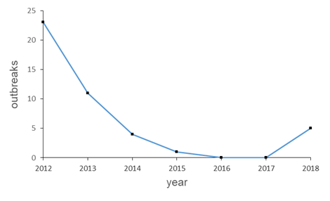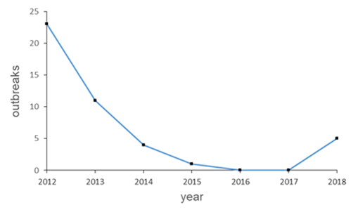 Figure 1. Number of annual bovine rabies outbreaks in Orellana, 2012 to 2018