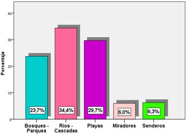 Del total de encuestados, el 34.4% conoce que los ríos y cascadas están contaminados por el exceso de basura en especial de materiales plásticos, seguido del 29.7% que corresponde a uno de los lugares más atractivos por los turistas las playas y con un 23.7% bosques y parques. Frente a esto, los actores involucrados deben tomar medidas para conservar los sitios turísticos.