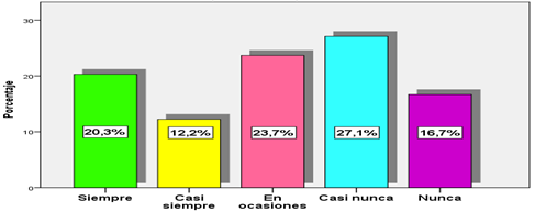 Podemos observar que el 27.1% no participaría en las campañas de limpieza para mantener los lugares turísticos libre de plástico. El 23.7% en ocasiones se uniría, de manera que no es una solución óptima para resolver el problema de la basura que cada día toma más fuerza.