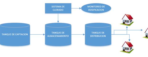 Para iniciar con la implementación se realizó un diseño base del sistema de cloración como se muestra en la figura1, el cual va desde el tanque de captación hacia el tanque de almacenamiento donde se realiza el clorado el mismo que será monitoreado, una vez aplicada la dosificación de cloro el agua se bombeará al tanque de distribución y finalmente a los domicilios.