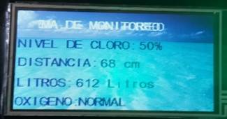 El elemento receptor procesara los datos y se visualizará en la pantalla el nivel de cloro, la distancia, los litros de agua y el nivel de oxigeno del ambiente considerando normal y peligroso como se ve en la Figura 14, también se encenderá luces indicadoras según el porcentaje de pastillas de cloro.