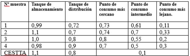 En la última muestra indica los rangos de concentración de cloro que va de 0,3 a 1 ml/l según la ubicación de las casas considerando las más cercanas con un elevado porcentaje de cloro sin descuidar los parámetros accesibles para el consumo humano como se muestra en la Figura 17, aumentando la fiabilidad de la muestra por medio de nuevos análisis de cloro residual libre en CESTTA.