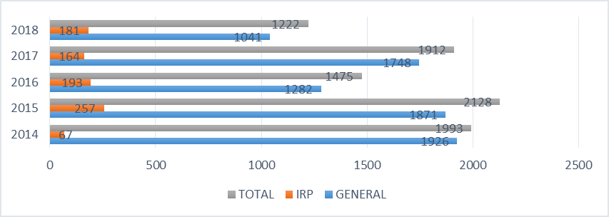 No obstante de aquello, no existe tendencia en los datos, los informes generados (hasta la fecha de recolección de información), se encuentran muy por debajo de los años anteriores. Los años 2014 y 2015 son los que más informes generados poseen en comparación con los demás años del análisis, sin embargo se observa también que los indicios de responsabilidad penal en aquellos años no son necesariamente correspondientes con los informes generales (2014 por ejemplo). El año 2018 cuenta con 181 establecimiento de indicios de responsabilidad penal, significativo al compáralo con los informes generados; y, correspondiente con la realidad ecuatoriana en términos de detección de actos investigados por corrupción de conocimiento público.