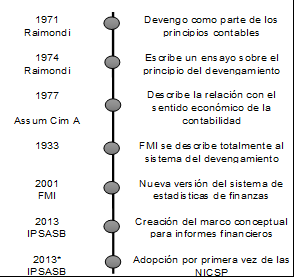 Sin duda, uno de los principios más importantes en el sector público, es el método de acumulación o devengo que elimina la versión que se ha venido utilizado con el criterio de caja o caja modificada. En el ámbito gubernamental el registro del devengado se conforma del principio del ejercicio o también llamado de los períodos contables, por cuanto se busca confrontar los ingresos y gastos de un período indicado, este reconocimiento se registra en el momento en el que sucede los movimientos de bienes y servicios, y no cuando existe movimiento monetario o financiero derivado del ejercicio (Ryan, 1998).