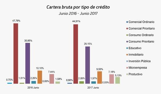 Para el período 2016 – 2017 se evidenció un crecimiento de 14,7% en la cartera bruta, alcanzando según datos de la Superintendencia de Bancos un total de 21.443 millones de dólares, siendo el segmento comercial prioritario al que se le otorgó la mayor parte del crédito, en segundo lugar, está el consumo prioritario con el 28,15%. Es importante resaltar que en este periodo se logró reducir el índice de morosidad de 4,35% a 3,35%.