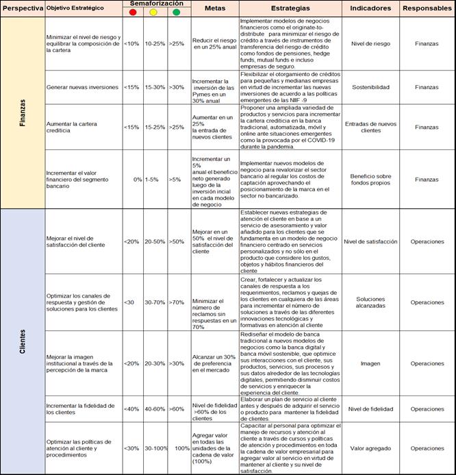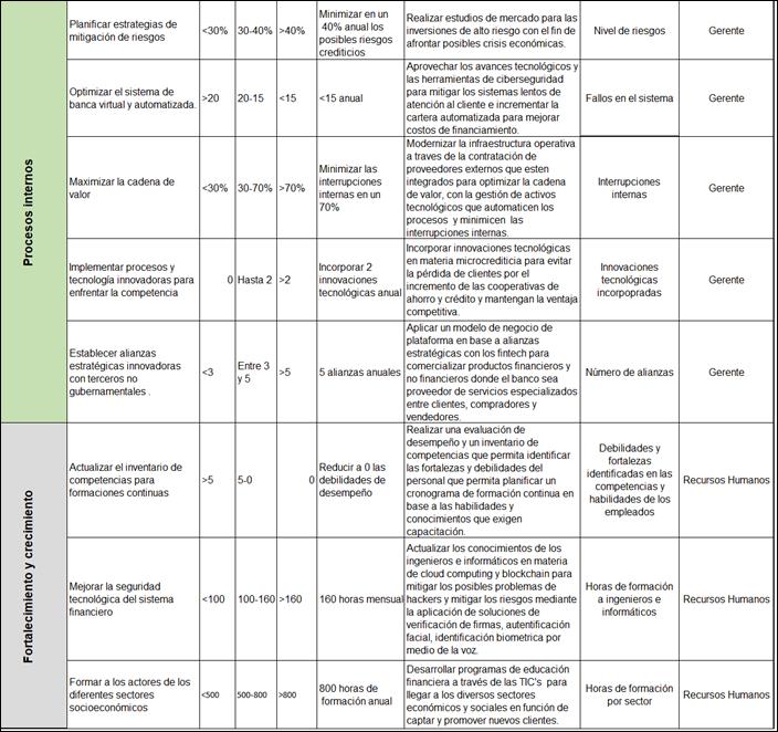 La tercera estrategia consiste en el diseño de un cuadro de mando integral, el cual permite medir la evolución de la actividad empresarial partiendo de la formulación de objetivos estratégicos, medidos en base a indicadores financieros y no financieros, estos a su vez permiten recopilar información periódica que sirve en la toma de decisiones y en el cumplimiento de las metas fijadas. La semaforización del cuadro de mando integral facilita a los altos mandos el seguimiento del plan estratégico, permitiendo identificar los valores que no cumplieron con lo esperado (color rojo) o los valores que han alcanzado la meta (color verde).
