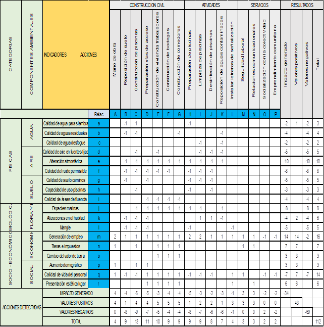 En la tabla 7 se presenta matriz de medición de impacto ambiental basada en el modelo de Leopold que determina el nivel de impacto que generan las actividades que desarrollan las empresas camaroneras. Para el efecto cuenta con un sistema de valoración correspondiente al grado de interés e importancia de las acciones que realizan, en magnitud de extensión impacto ambiental, considerando (1–2) cumplimiento puntual, (3–4) cumplimiento parcial, (5–6) cumplimiento medio, (7–8) cumplimiento extenso; en cuanto a la importancia se mide en las consecuencias del impacto generado sobre el medio, teniendo entre (1–2) muy baja, (3–4) baja, (5–6) moderada, (7–8) alta, (9–10) muy alta; al considerar valores negativos, se establece que el nivel de cumplimiento y grado de importancia queda por debajo de los límites previstos.