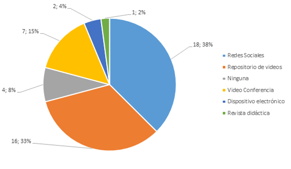 De acuerdo a la gráfica se puede observar que el 38% de los docentes encuestados utilizan las redes sociales como recurso para llegar con la enseñanza-aprendizaje a sus alumnos, y el 33% hacen uso de repositorio de videos y, apenas el 15% utiliza video conferencia.