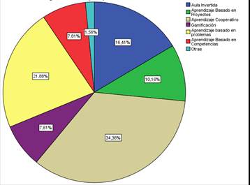 Como se puede observar en el Figura 1, y tomando en cuenta los 3 porcentajes más significativos, del total de los 128 docentes encuestados el 34,38% que corresponden a 44 afirman que durante la clase de matemáticas aplican el Aprendizaje Colaborativo; el 21.88% que corresponde a 28 educadores aplican el aprendizaje basado en problemas; el 16,41% que corresponde a 21 maestros aplican la metodología del aula invertida y en porcentajes menores el aprendizaje basados en proyectos, Aprendizaje Basado en Competencias, Gamificación y otras. En consecuencia, por lo expuesto se verifica que los educadores utilizan diferentes metodologías activas dentro del aula de clases.