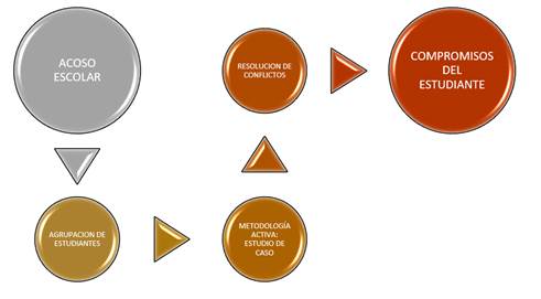En este artículo he señalado las formas de violencia que existen dentro de la institución educativa como son las físicas, psicológicas, sexuales y cyberbullying, también se ha considerado los factores de origen para propiciar estas conductas negativas entre ellos tenemos los familiares, emocionales, de indole cultural, pues el simple ejemplo que viven en sus hogares los hacen que actúen de esa manera, es indudable que los niños que reciben en sus hogares maltrato, golpes, insultos tengan la necesidad de sentirse importantes, llamando así la atención dentro de su entorno, todos estos modelos de acoso crea en los estudiantes una baja autoestima lo cual dificulta en ellos su desarrollo personal, social y académico, los mismos que generan consecuencias que en ciertas ocasiones pueden ir desde la deserción escolar hasta provocar lesiones irreparables como el homicidio o suicidio, por ello la necesidad de implementar la utilización de la metodología activa, estudio de caso, pues los estudiantes a través de su propia investigación se vuelven protagonistas de su aprendizaje, creando nuevas experiencias a partir de situaciones reales, tomando conciencia de la realidad se puede formar en ellos una empatia ,además el hecho de ponerlos en práctica tanto en el ambiente escolar como en el hogar se puede prevenir dicha violencia.