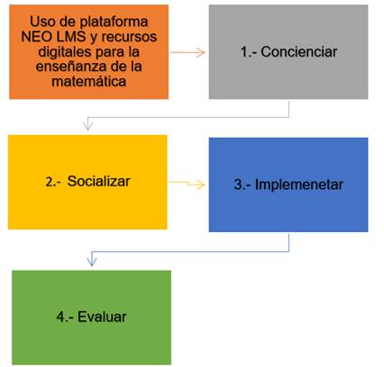1. Concienciar. La utilización de las plataformas virtuales para la enseñanza- aprendizaje de forma prioritaria en la asignatura de matemática con la plataforma NEO LMS misma que permite acceder a su plan gratuito inscribiendo hasta 400 estudiantes, el docente puede implementar varios recursos digitales novedosos que ayuden a fortalecer sus clases permitiéndole ser innovador, creativo y que despierte en los estudiantes el gusto por aprender, de esta manera se estará reduciendo las clases tradicionales que se siguen manteniendo en la enseñanza de la matemática ya que el docente resuelve ejercicios en el pizarrón y el estudiante copia el proceso en su cuaderno, repitiéndolos de forma mecánica, al permitir a los estudiantes trabajar de forma distinta a la habitual se estará generando un aprendizaje innovador.