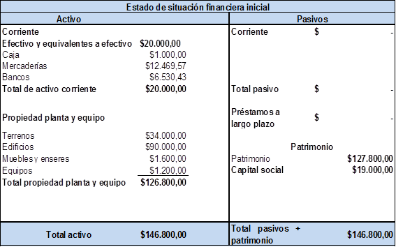 Para el inicio de actividades es necesario estructurar un estado de situación inicial de la empresa agregando los activos corrientes, fijos y capital en este caso se cuenta con recursos propios por lo que no se tiene pasivos corrientes ni a largo plazo, cuando el negocio este en marcha si es necesario realizar un préstamo se analizara las diferentes instituciones financieras, A continuación, se presenta el estado de situación inicial.