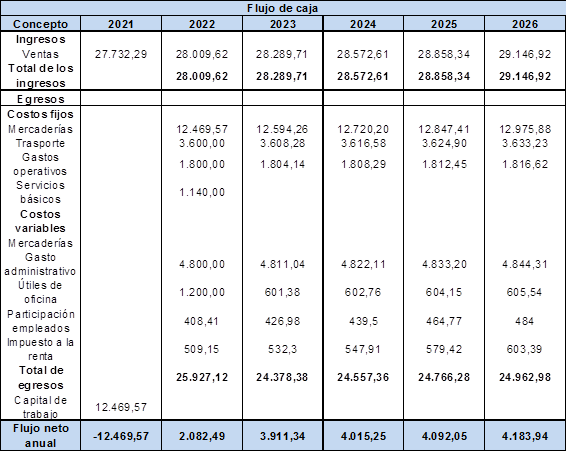 Se realizó los posibles flujos de efectivo para los primeros 5 años, agregando la inflación de 0.23% en los costos y gastos, con un aumento de participación de la demanda al 10%, se puede ver la figura siguiente el flujo mencionado.