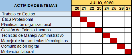Cronograma de Actividades: Establece el periodo de tiempo en el cual se desarrollará la capacitación al personal de la asociación tanto a socios como a trabajadores, comprendidos en ocho actividades que se desarrollaran del 20 al 27 de julio del 2020.