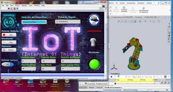 The research aimed to design a control and monitoring system for a robotic arm integrating Labview, Solidworks and the Internet of Things. It was based on the constructivist approach to learning, complementing connectivism as an approach that contributes to interconnecting knowledge in work nodes, in order to generate new knowledge from the transformation of initial information. The prototype arm control process is mainly based on the execution of LabVIEW software and IOT technology, backed by engineering software that guarantees the viability of the research. The virtual remote simulation of the prototype robotic arm was generated by the link between the LabVIEW and SolidWorks software with total success, since there were different stages in charge of validating previous actions, the case of this simulation was verified in different softwares to mention the application created for visualization remote.