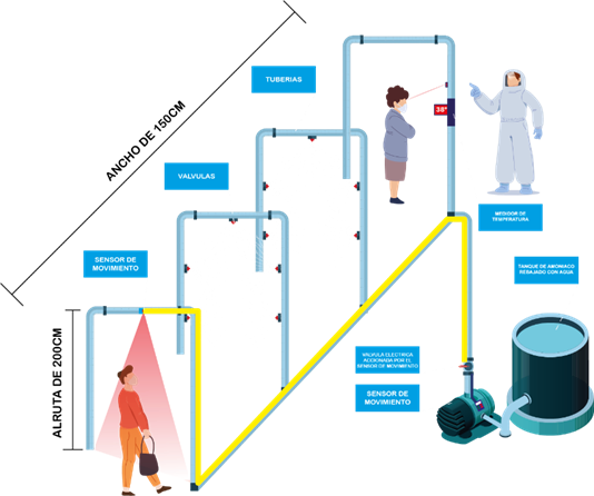 Se armaron las tuberías que transportarían el liquito colocando tres arcos con las tuberías, en cada arco se colocan 5 nebulizadores de fumigación, produciendo una neblina con el líquido desinfectante para no empapar a las personas, se realizó un sistema de pulverización el cual convierte el agua en pequeñas partículas de amonio cuaternario de quinta generación, este producto químico que combate la propagación y contiene agente antibacteriales, antimicrobianos y antivirales, fue aprobado por el Instituto Nacional de Vigilancia de Medicamentos y Alimentos (INVIMA), del Ecuador.