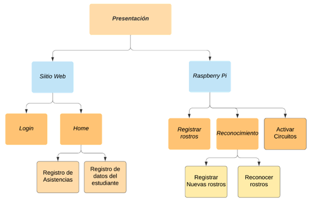 El diagrama de navegación explica el funcionamiento del sitio web que es el encargado de manejar un login de ingreso y a su vez registrar a los estudiantes y la asistencia, por otra parte se tiene la Raspberry Pi como unidad de control de los procesos que guarda imágenes simultaneas de los rostros de los estudiantes, docentes o personal que ingrese a los laboratorios de computo de UNIANDES Quevedo, se registren el sitio Web, esta tarjeta digital es la encargada mediante algoritmos de reconocimiento facial, y la codificacion mediante Phython enbebido en ella sobre la paltaforma Linux, quien mediante un procesos de emparejamiento reconoce lo rostros y da acceso al ingreso y registra su asistencia, de ser el caso de no reconocer el usuario debe registrarse como un usuario nuevo como se observa en la figura 1.