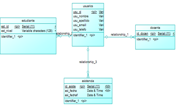En el modelo de base de datos se puede determinar la organización lógica del almacenamiento de los datos obtenidos del prototipo de sistema automatizado del control de asistencia en los laboratorios de UNIANDES Quevedo, las tablas de la base datos propuestos como solución, con toda la información recolectada para llenar, por parte de los usuarios (docentes y estudiantes), registrándose fecha y hora, con sus atributos, como se observa en la figura 2.