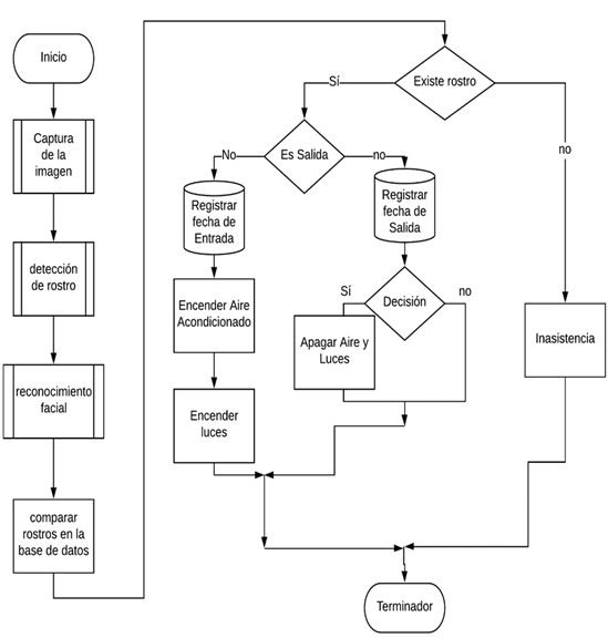 Este algoritmo tiene su inicio capturando la imagen detectando los rasgos físicos del rostro, luego compara los rostros en la base de datos, si no existe el registro de este rostro tendrá una inasistencia y termina, caso contrario si este registra su rostro tendrá su asistencia y guardara la hora de entra y salida del salón de clases, al momento que el primer alumno o maestro ingrese al salón de clases o laboratorio este activará el encendido del aire acondicionado y luces, en la hora de salida por decisión el sistema apagará todo. Como se puede observar en la figura 3.