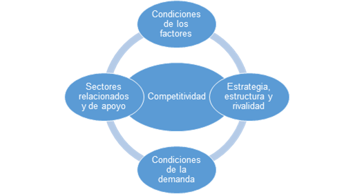 Si bien es cierto que se ha definido la competitividad y analizado las principales estrategias en función a la importancia que tiene cada una de ellas dentro de las empresas, es fundamental también plasmar las fuerzas competitivas que las organizaciones deberían tener en cuenta para generar ventajas competitivas que hagan que una marca se consolide en su campo o un producto se posicione adecuadamente en el mercado. Una herramienta que hace posible el análisis es el diamante de Porter que se muestra en la figura 1.