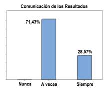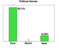 La figura 4 muestra los resultados en cuanto a la información. Aunque la mayoría de los directivos (54.76%) responden de que existe un plan de comunicación comercial, la diferencia es mínima con quienes manifiestan que no conocen de ese plan. También el grupo de colaboradores plantean en su mayoría (71.43%) que la comunicación de los aspectos comerciales es esporádica. Significativo así mismo es que la mayoría de los directivos (52.17%) que plantean una segmentación eficaz del mercado y los clientes, reconocen a su vez que no disponen de un plan de comunicación comercial. En cuanto a la comunicación de las políticas para el manejo de la competitividad, la mayoría de los colaboradores (85.71%) plantean que conocen poco o nada de estas políticas. Al igual que para la dimensión de mercadotecnia, los resultados sobre el flujo de información del tema competitividad reflejan que no se ha concebido una orientación al mercado y se tiene más bien un enfoque orientado a la producción y las ventas.