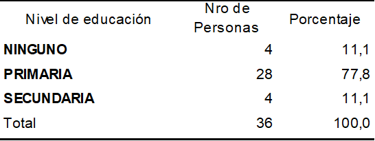 Se puede observar que, del total de encuestados, el 11% no tiene un nivel de educación, al igual los que tiene un nivel de educación secundaria; el 78% tiene una preparación primaria, es decir debido a circunstancias externas y económicas alcanzaron un nivel de educación mínimo, de estos el 72% de macaneros pertenecen a la comunidad de Bullcay mientras que solo el 28% son de la comunidad de Bulzhún.