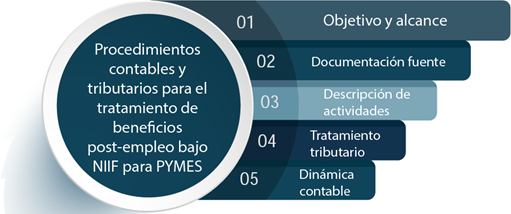 Se tiene como objetivo elaborar un manual de procedimientos contables y tributarios para el tratamiento de beneficios post-empleo en las compañías de transporte de carga pesada en el Cantón La Troncal bajo NIIF para PYMES y la revelación de información sobre beneficios a empleados. De tipo descriptiva no experimental con diseño de campo. Los empresarios se enfocan en el cumplimiento de las obligaciones tributarias a fin de evitar sanciones por parte de la administración tributaria como multas, clausuras, suspensión de actividades, decomisos o incautaciones, dejando en segundo plano la contabilidad. Es importante la contratación del actuario independiente calificado por los organismos de control para el cálculo de la reserva matemática actuarial de las reservas por jubilación patronal y desahucio, son estos profesionales los que tienen la experticia necesaria para valoración de pasivos laborales.