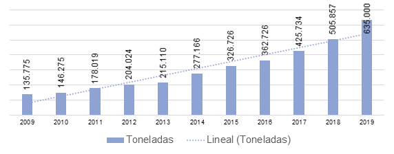 El Ecuador se encuentra entre los cuatro principales productores a nivel mundial de camarón junto a la India, Vietnam e Indonesia. Se ubica en el segundo lugar, y ha mostrado un crecimiento sostenible desde el año 2009 como se observa en la figura 1. Desde el año 2011 a 2019, la producción se incrementó cuatro veces, pasando de 178.000 a 635.000 toneladas exportadas (Registro Oficial Nº 187). En Ecuador existen alrededor de 210.000 hectáreas de camarón en cautiverio que se encuentran distribuidas y dispersas de la siguiente manera: Guayas 60%, El Oro 15%, Esmeraldas 9% al igual que Manabí y Santa Elena 7% (Durán-Ganchoza, 2016).