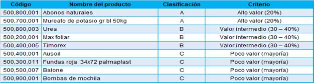 Figura 3. Insumos agrícolas clasificación ABC.