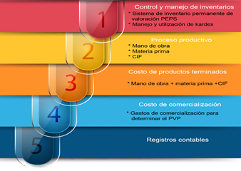 Desde otra perspectiva, los elementos necesarios para la elaboración o manufactura de un producto es la producción misma, la influencia del mercado, lo que se gasta en salarios y la situación financiera, elementos que influyen de manera gradual en el precio final del producto, pues no debe incluirse solo el valor de los materiales, sino el salario de los trabajadores, el mercadeo y publicidad, la carga impositiva, entre otros; la importancia de realizar una contabilidad de costos en una empresa está en el control de los procesos que se realizan, información que se convierte en decisiones beneficiosas (Ayala & Fino, 2015). Los datos obtenidos a partir de la contabilidad de costos se transforman en la posibilidad del desarrollo de nuevas ideas y el diagnóstico de los procesos desde un enfoque de eficiencia, y los documentos contables mantienen la situación de la empresa y el éxito de la contabilidad de costos consiste en que la empresa logre un equilibrio general entre ingresos y gastos (Capa-Benítez, et al., 2019).