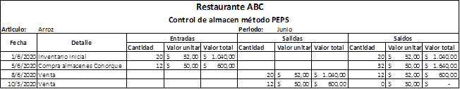 Figura 4. Control de almacén método PEPS