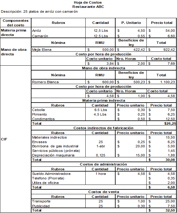 Figura 5. Hoja de costos.