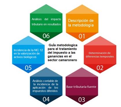 El objetivo del presente estudio consistió en diseñar una guía metodológica para la aplicación de la NIC 12 en las empresas camaroneras, como mecanismo de determinación de resultados reales y base imponible de impuesta a la renta. De tipo descriptiva no experimental. Se determinó que la mayor parte de las empresas de camaroneras en la provincia de El Oro presentan sus estados financieros en forma anual, es así que, por lo que los profesionales contables valoran los activos biológicos al año y una cantidad minoritaria lo hacen de manera semestral (2,30%), sin embargo, en algunos casos nunca han realizado valoraciones de sus activos biológicos como lo establece la normativa NIC 41. El proceso metodológico propuesto proporcionará una guía para la aplicación de la NIC 12, sustentada en la normativa tributaria vigente.