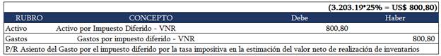 Figura 4. Asiento contable por el impuesto diferido al aplicar la tasa impositiva en la estimación del valor neto de realización de inventario.