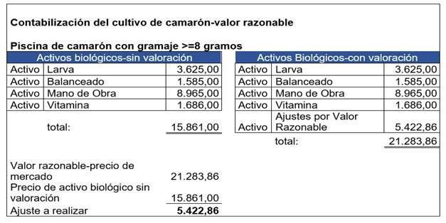 La valoración del activo biológico se realiza considerando la suma de los costos de larva, balanceado, mano de obra, vitaminas y otros que intervengan en el crecimiento del camarón y se compara con el valor presente del mercado, se reconocer un ingreso por su crecimiento al cierre de cada ejercicio, tomando en referencia cuando tiene la talla de 8 gramos o superior, asumiendo el precio de mercado se solicita vía mail una o varias cotizaciones a las exportadoras de camarón, para el precio de mercado activo las exportadoras de camarón toman en cuenta en las cotizaciones la textura y talla que se obtiene del histograma de la piscina enviado por el biólogo de la camaronera, con el precio de mercado obtenido menos los costos de producción se contabiliza el asiento de ajuste por valor razonable (ver figura 5).
