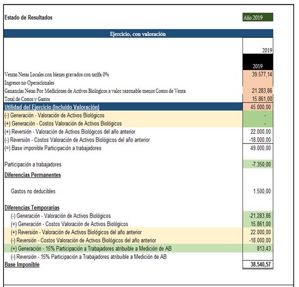 En el cierre del ejercicio comparativo del año fiscal 2019 se registra el total de la utilidad incluida la valoración, la reversión de la valoración del año anterior en positivo y en negativo, como la normativa tributaria contempla que no se adiciona la valoración de activos biológicos del año presente para la base imponible antes de participación trabajadores, en este cálculo, se procede a aplicar el 15% de participación a trabajadores permitiendo observar un incremento en su valor, adicional se realiza el asiento contable del gasto por impuesto diferido, multiplicando por el 25% del impuesto a la renta, (ver figura 8) se exponen a continuación: